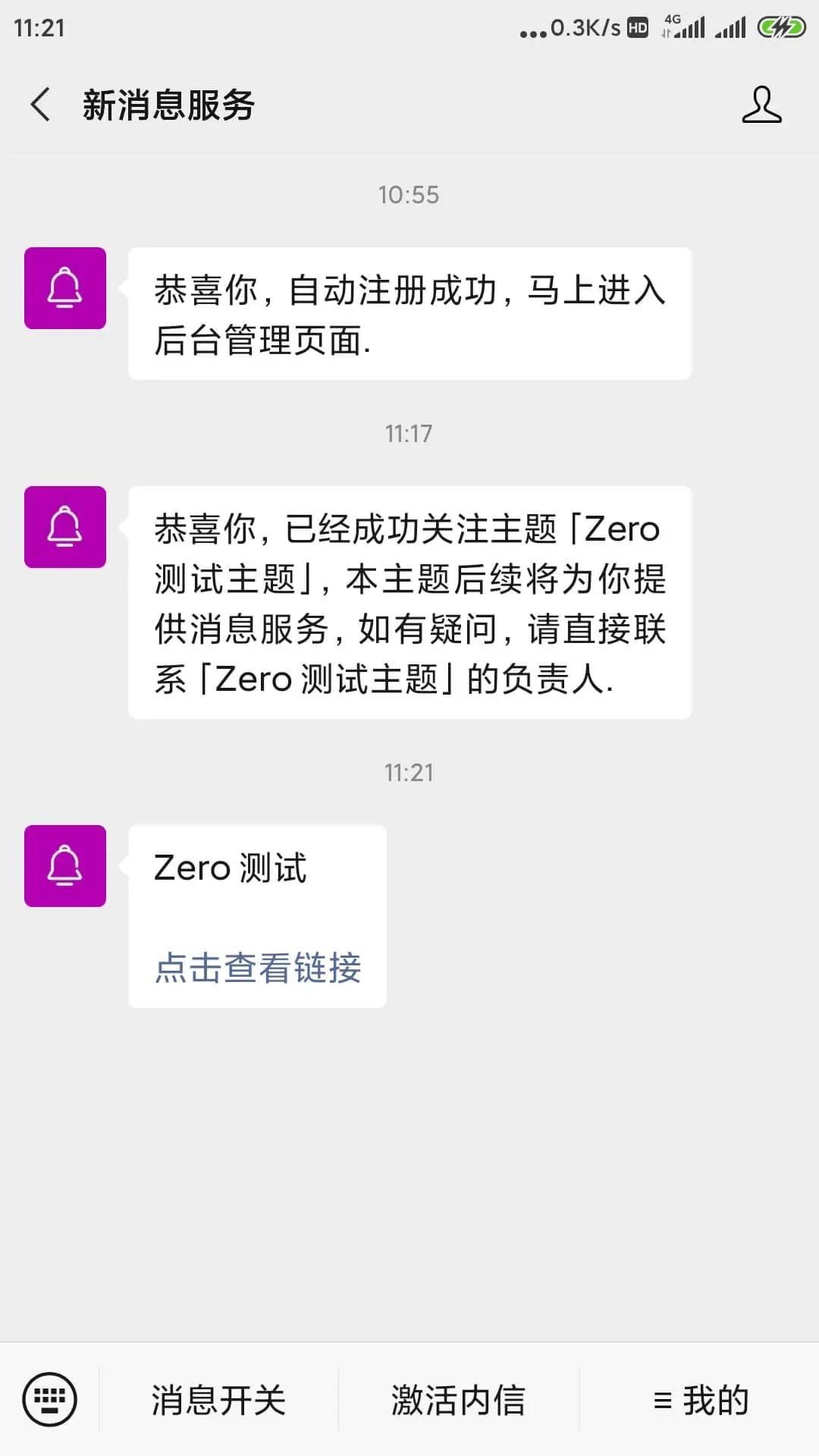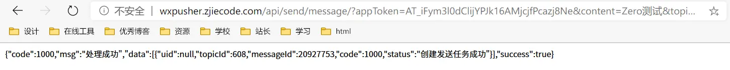 http://wxpusher.zjiecode.com/api/send/message/?appToken=AT_iFym3l0dClijYPJk16AMjcjfPcazj8Ne&content=Zero测试&topicId=608&url=https://example.com请求参数:appToken、uid、topicId、content、url ,其中 content 和 url 请进行urlEncode 编码。