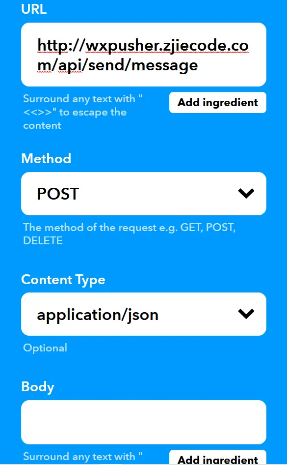 http://wxpusher.zjiecode.com/api/send/message #URL POST #Method application/json#Content Type